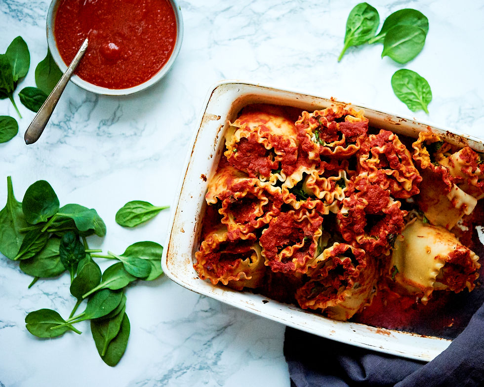 With all this dreary winter weather in Toronto, hearty and filling main dishes are one of the things that we crave most. Although a cheesy rich classic lasagna sounds so appealing, most of our clients can't eat cheese and gluten. So, we came up with something just as good that's dairy free and gluten free. This lasagna is full of saucy, baked tomatoes paired with creamy and rich "cheese" that's made from cashews and slightly sweet pumpkin. We love making this version of lasagna rolls instead of layering the lasagna noodles in a dish because it's easy to serve out and looks more interesting than a standard lasagna.