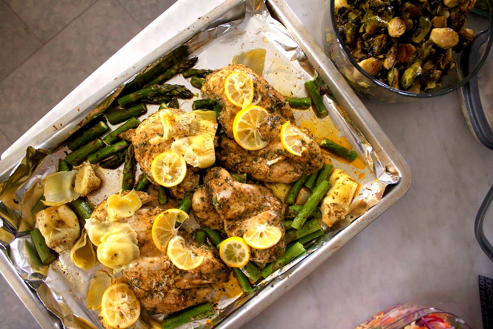 3 or 4 organic chicken breasts 2 meyer lemons (or regular lemon) 2 cloves garlic 1 inch piece ginger root 1/2 tsp cinnamon 1 tsp cumin 3 tsp paprika 1/4 cup fresh parsley 1/4 cup fresh cilantro 1/4 cup olive oil sea salt pepper 3 tsp honey 1 bunch asparagus 1 jar of artichokes Directions: