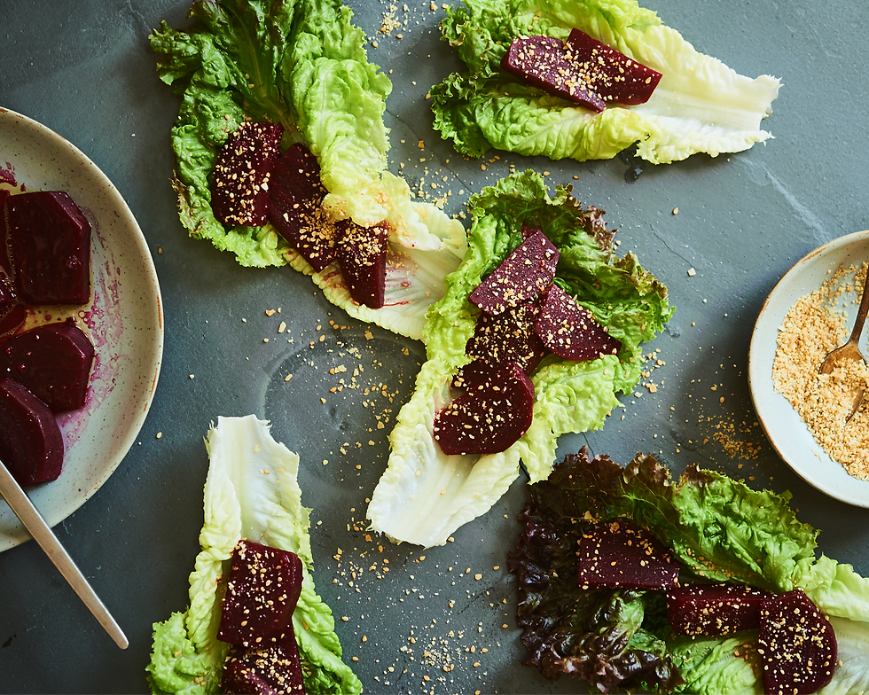 1. Peel the beets and cut into small wedges. 2. Place the beets in a small pot with around 1/4 cup of water (enough water to cover the bottom of the pot and some of the beets, but they don't need to be completely covered). 3. Bring to a boil and then reduce to a simmer. Cover and simmer on low heat for 15 minutes, or until the beets are tender. 4. Run the beets under cold water to cool them down. 5. Then toss the beets together with the marinade in a bowl. Add sea salt and pepper to taste> 6. While the beets are cooking- rinse off the lettuce well and make sure to dry. Pull the leaves apart carefully, leaving them whole (remove any wilted or dirty parts). 7. Place the leaves out on a serving platter and serve some beets into the center of each leaf. 8. Place the sliced almonds and sesame seeds on a baking sheet and toast lightly at 350 in the oven for 5-7 minutes, until just light golden (be careful not to burn). 9. Once toasted, pulse the almonds and sesame seeds in the food processor into a crumble. 10. Sprinkle the crumble over top of the beets right before serving.