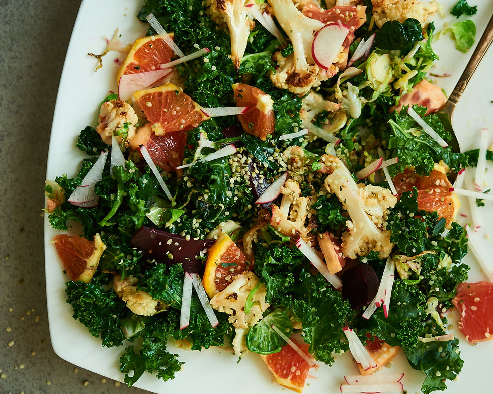 In this salad we use roasted cauliflower and roasted beets. It's optional to lightly saute the kale and brussels sprouts. If you prefer, you can keep these raw. We like to add in some freshly slivered radishes to provide that crisp bite. And, lastly, adding in some refreshing grapefruit and orange really rounds out the salad and adds some beautiful colour!